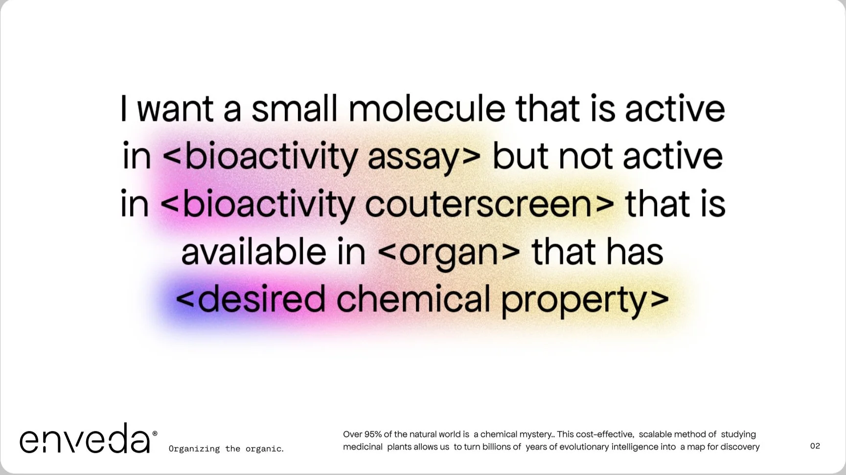 Enveda is transforming the way scientists explore nature’s chemistry. The future of human medicine is hidden in the world’s ancient, organic life forms—mostly plants. By cataloguing trillions of unexplored plant molecules, Enveda is populating the world’s largest computable database—making it easier for cure-seekers all over the world to find pathways to new medicine.